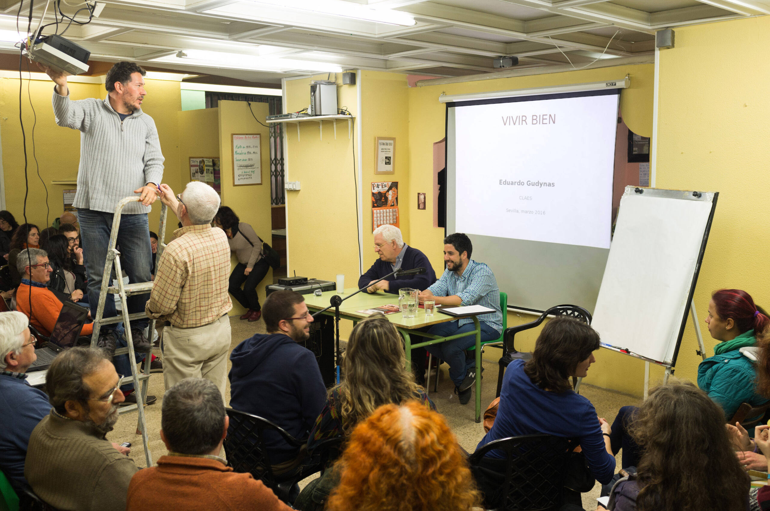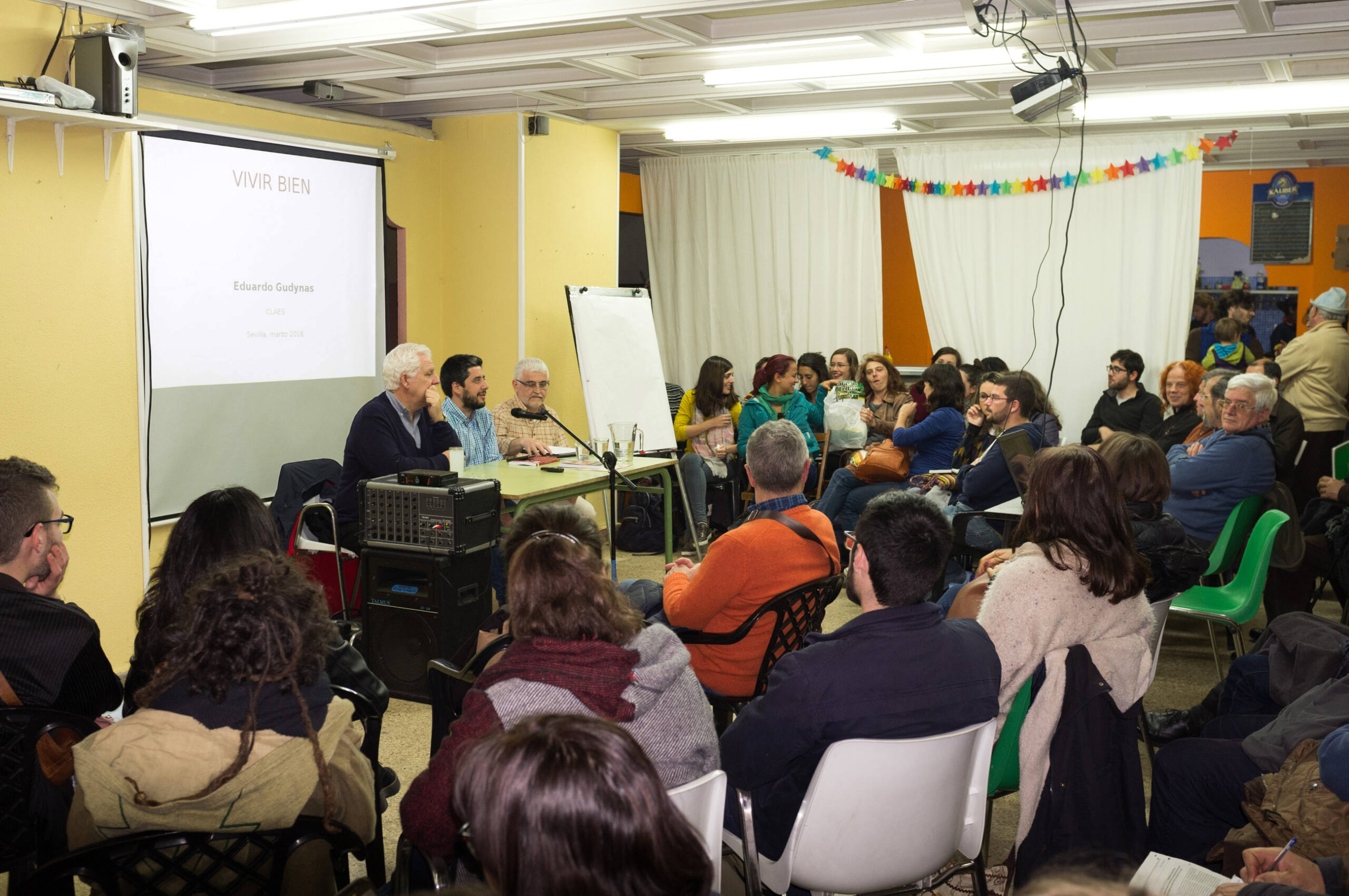 De este tiempo queremos que unos cuarenta y cinco minutos sean para que Eduardo Gudynas nos introduzca en la idea del Buen Vivir que se ha ido originando en América Latina, y una hora y cuarto a conversar con él sobre similitudes con iniciativas concretas que en el barrio del Pumarejo son intentos singulares de construcción de Buen Vivir a escala, o en ámbitos, o comunidades… pequeñas, cercanas.